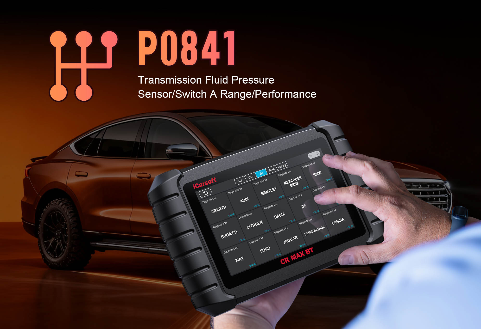 1. Plug into OBD-II port (use adaptors for older models). 2. Power on and select vehicle via Auto VIN Identify. 3. Navigate to Engine > Fault Codes (or Body) to confirm P0462. Tap Code Details for vehicle-specific tips (e.g., "Ford F-150: Check sensor voltage 0.5–4.5V").